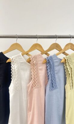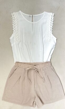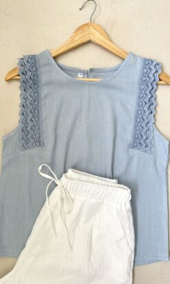 Blusa cuello bote sin mangas en lino rayón. Doble puntilla al tono en sisa. Espalda con abertura y botón pie perla.