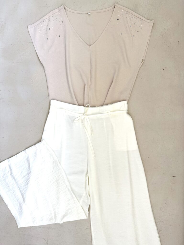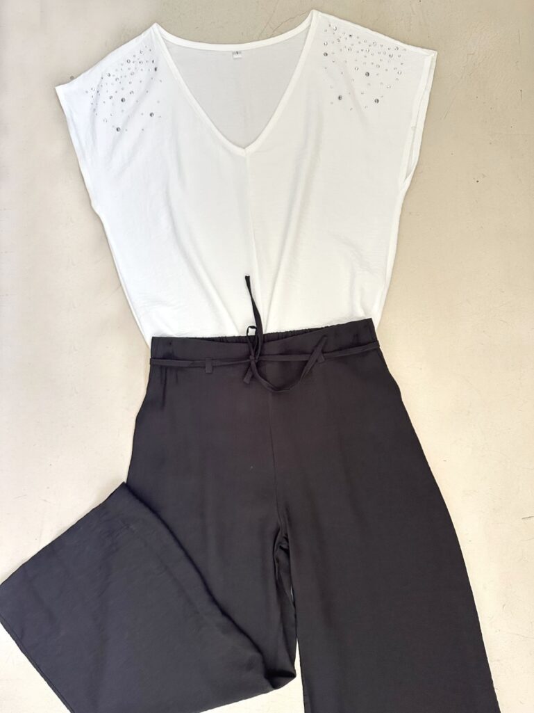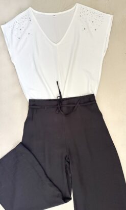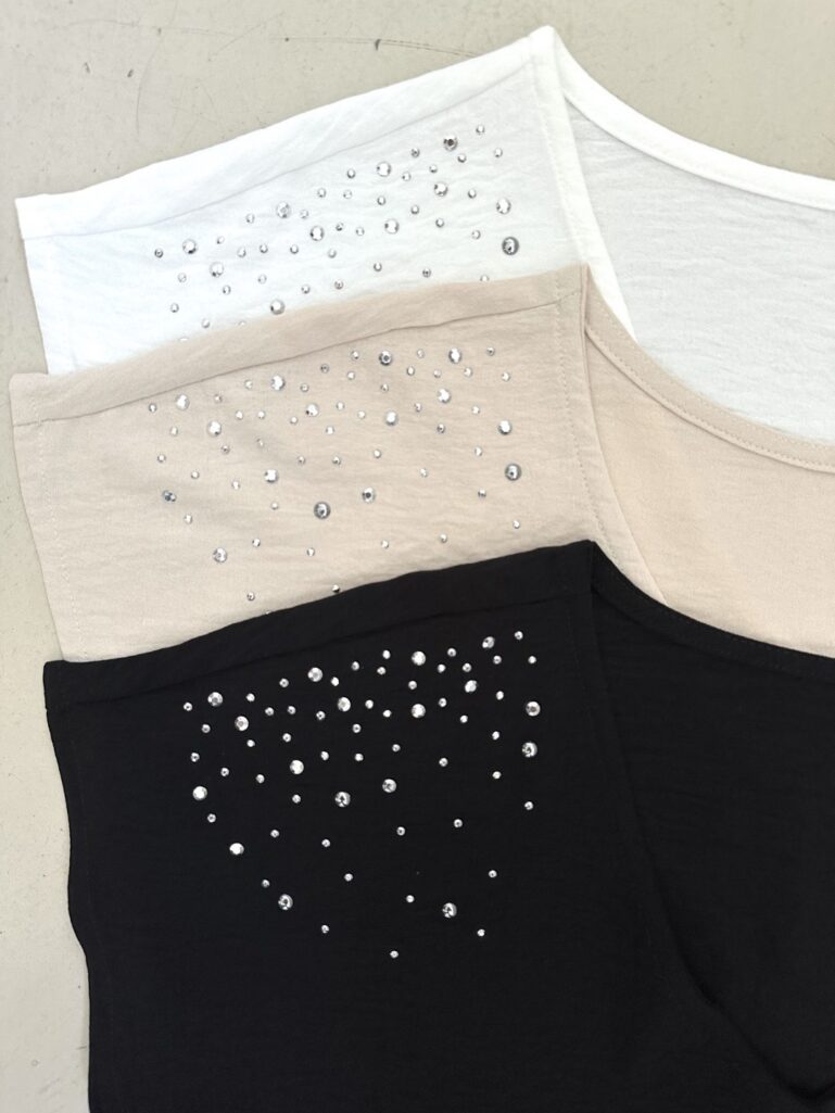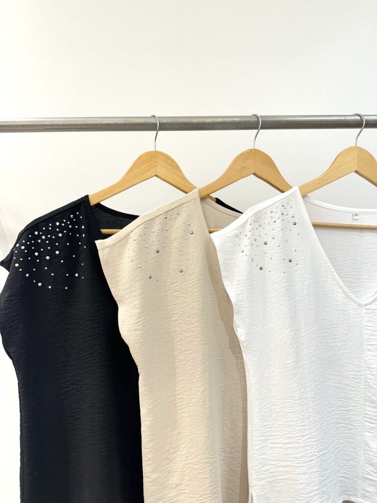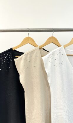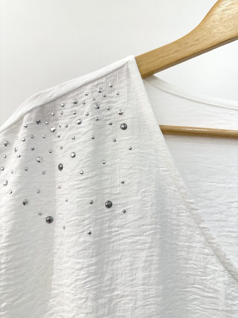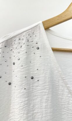 Blusa en crepe cey mangas japonesa con escote en V. Aplique de lluvia de tachas combi en hombros. Tajos en los laterales.