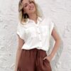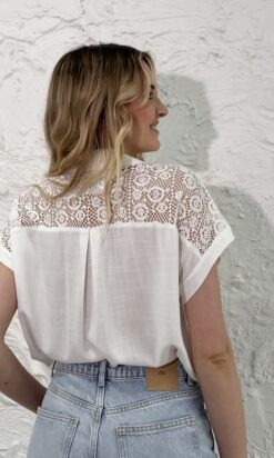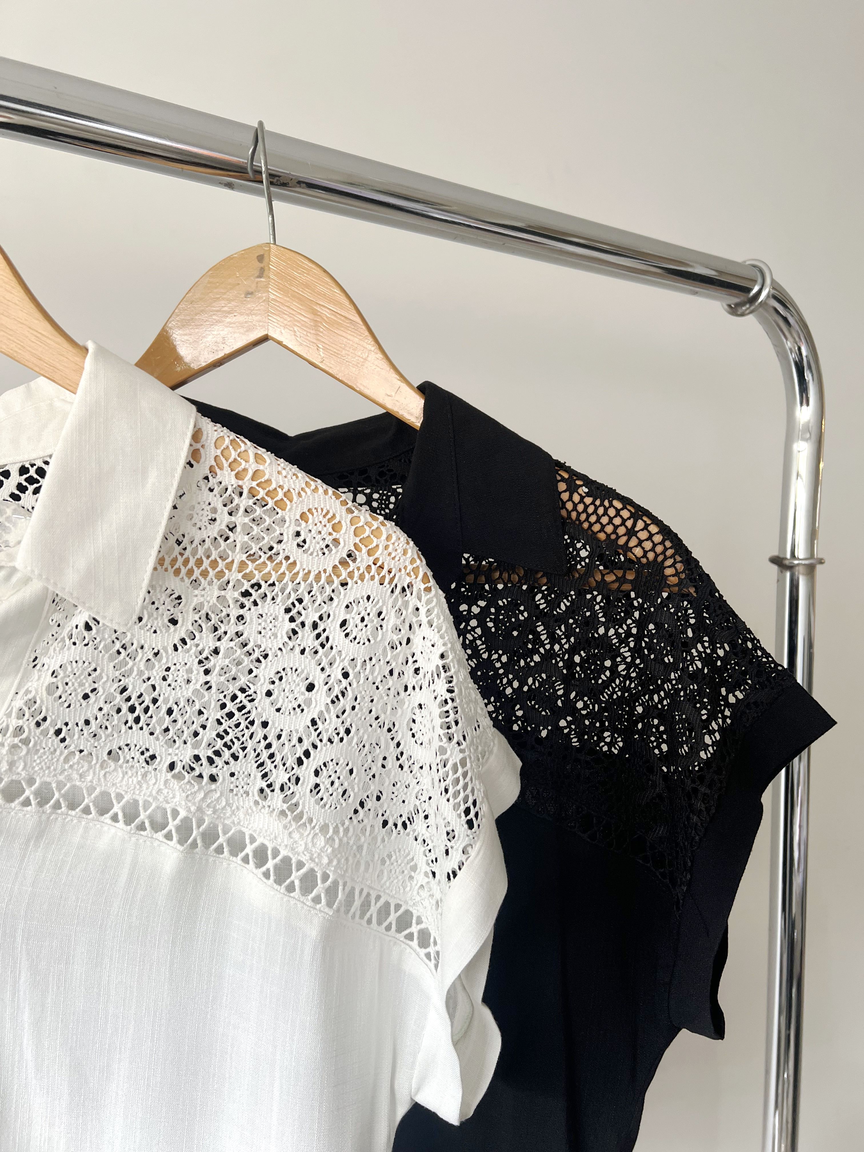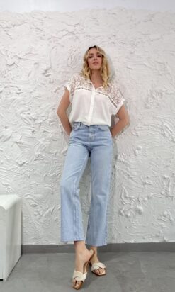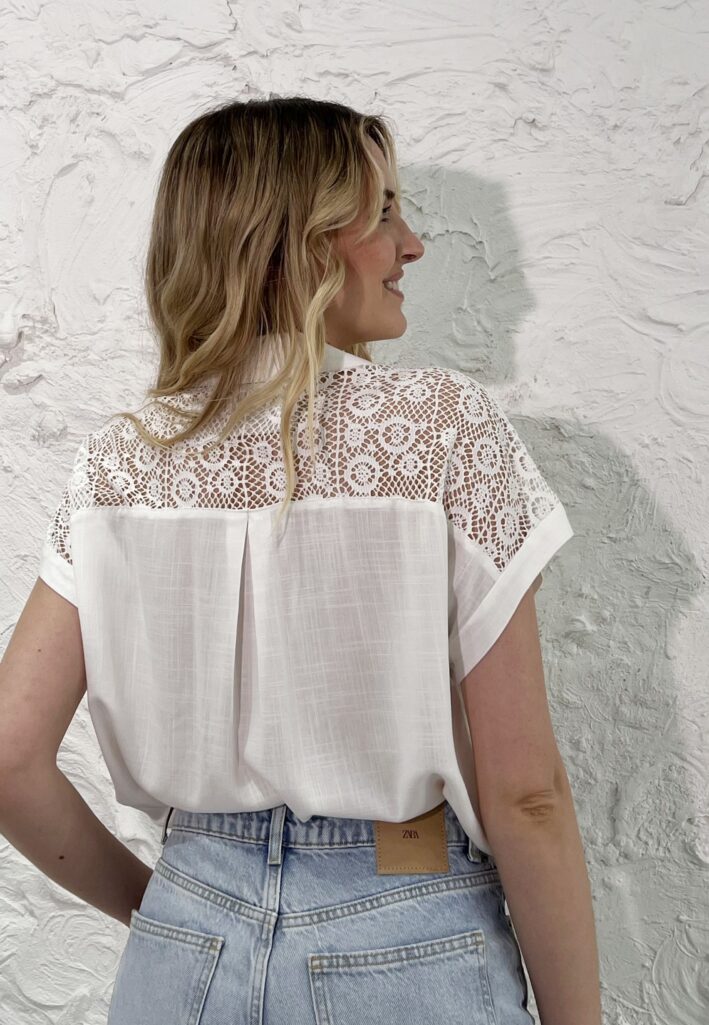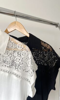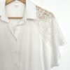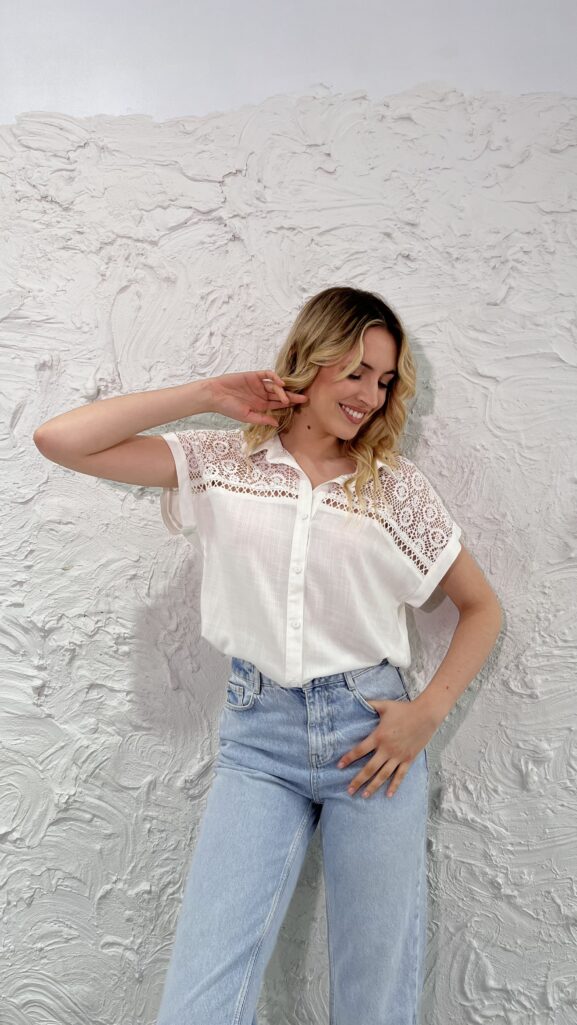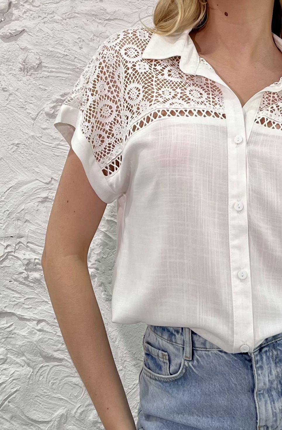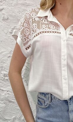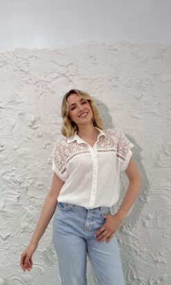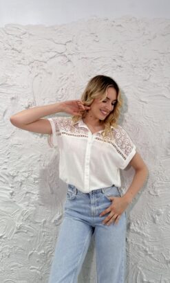 Camisa mangas cortas japonesa combi encaje en canesú con puntilla entredós en cruz al tono. Botones al tono.
