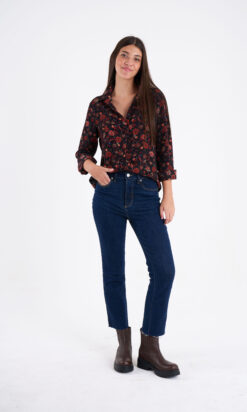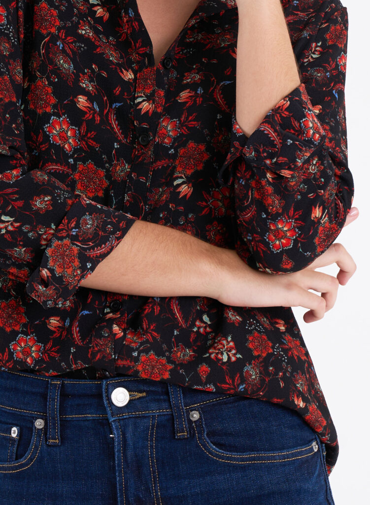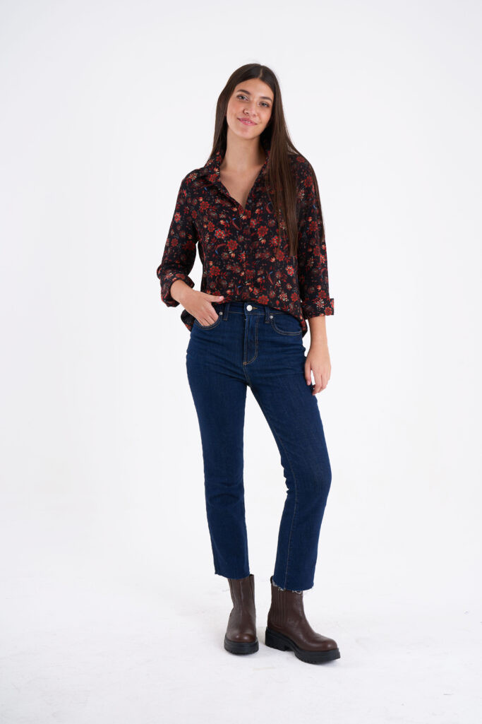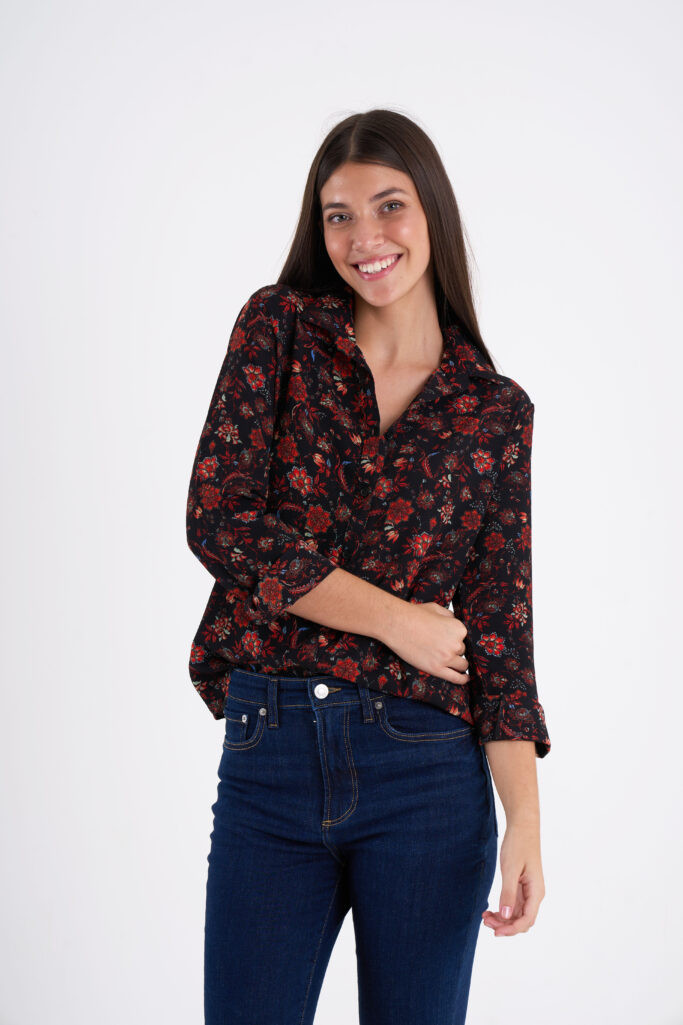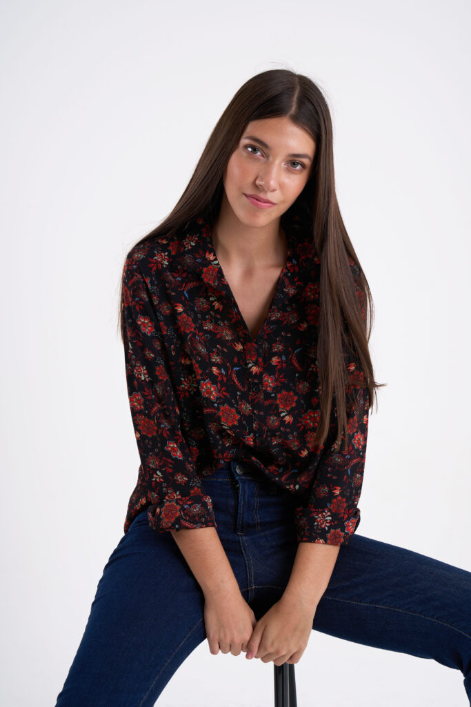 Camisa estampado floral, escote V manga larga.