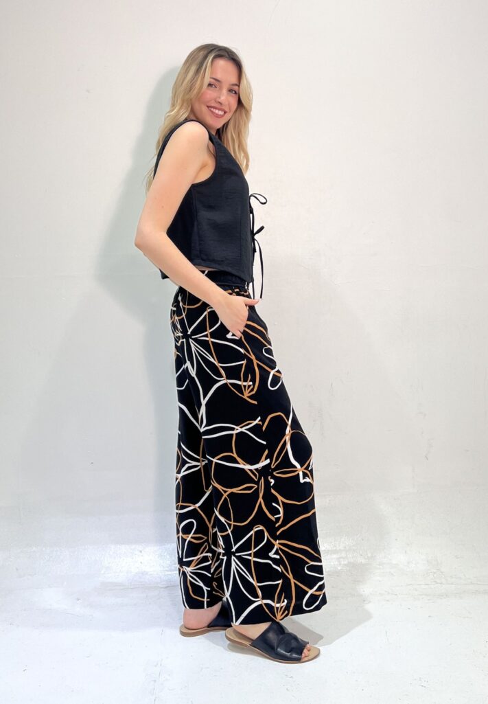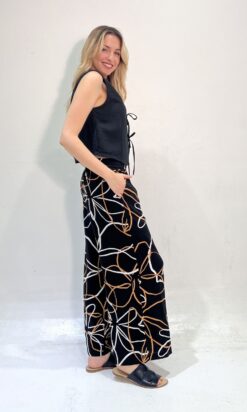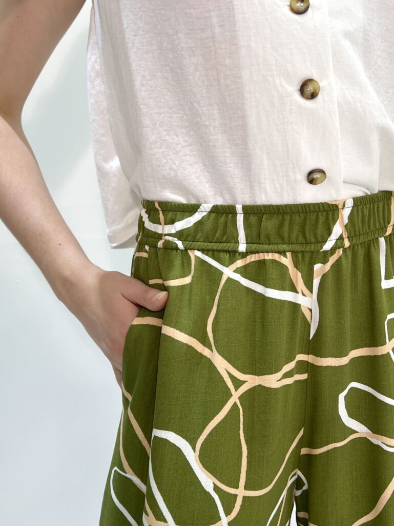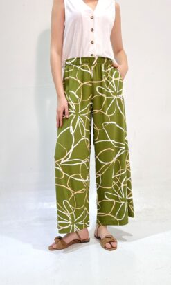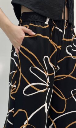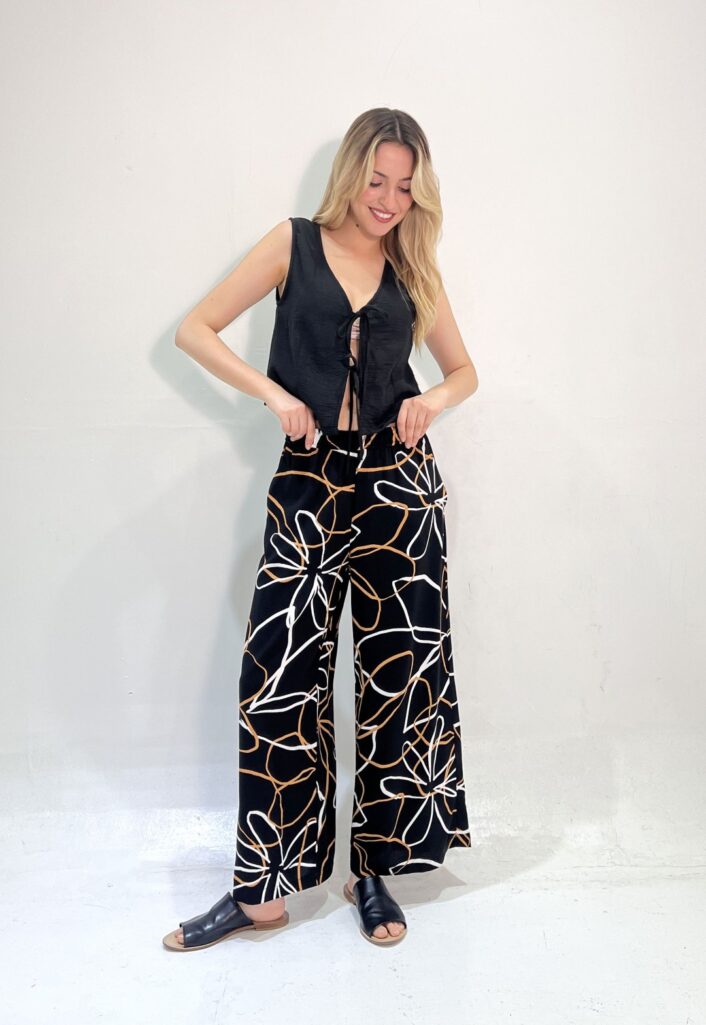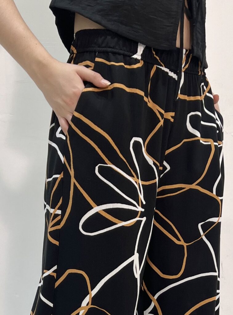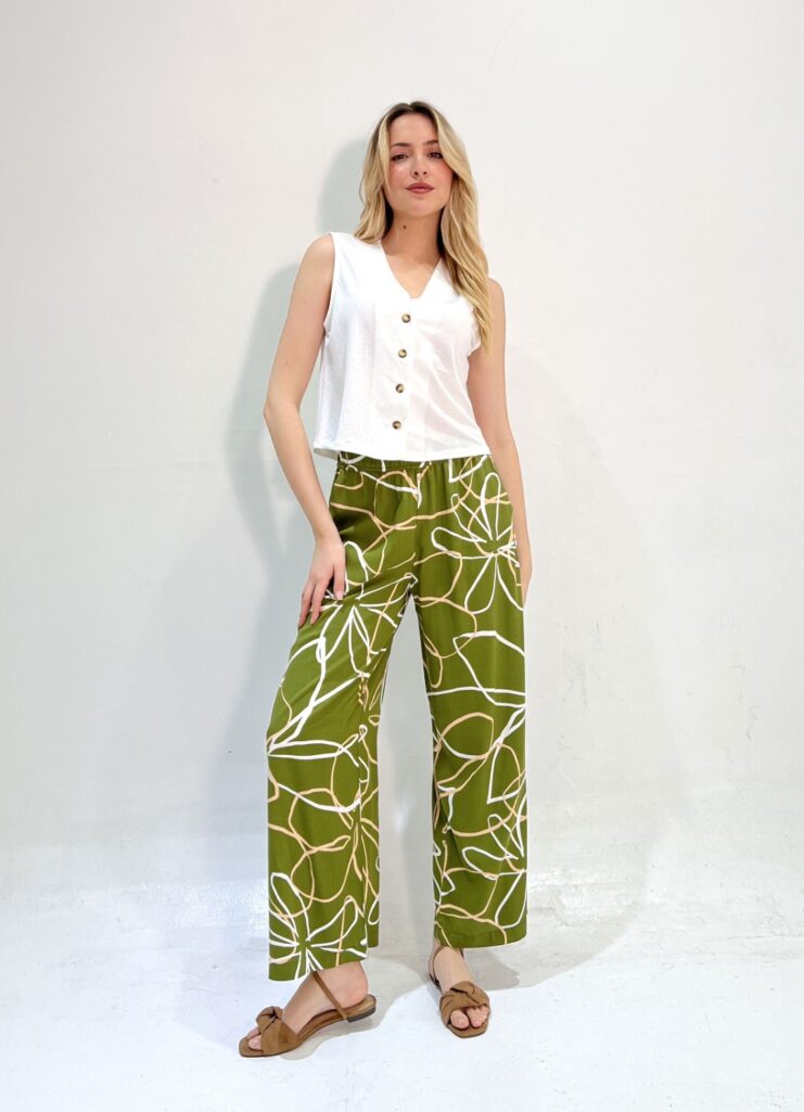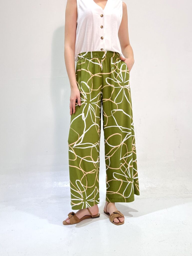 Pantalón palazzo en lino rayón estampado. Cintura con elástico en todo su contorno. Bolsillos en los laterales.