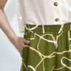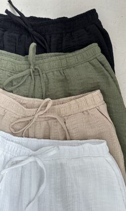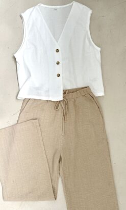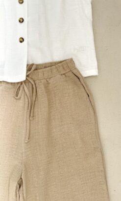 Pantalón ancho recto en símil lino rattier (textura con rayas). Cintura con elástico en todo su contorno con tiritas para atar. Bolsillos en los laterales.
