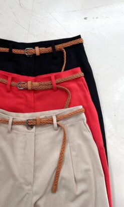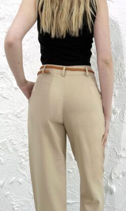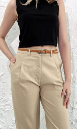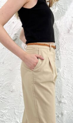 Pantalón en lino sastrero corte mom con pinzas. Bolsillos laterales. Botón marmolado. Viene con cinto trenzado incluído.