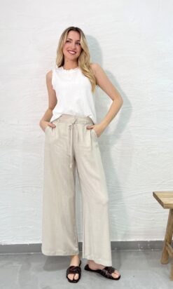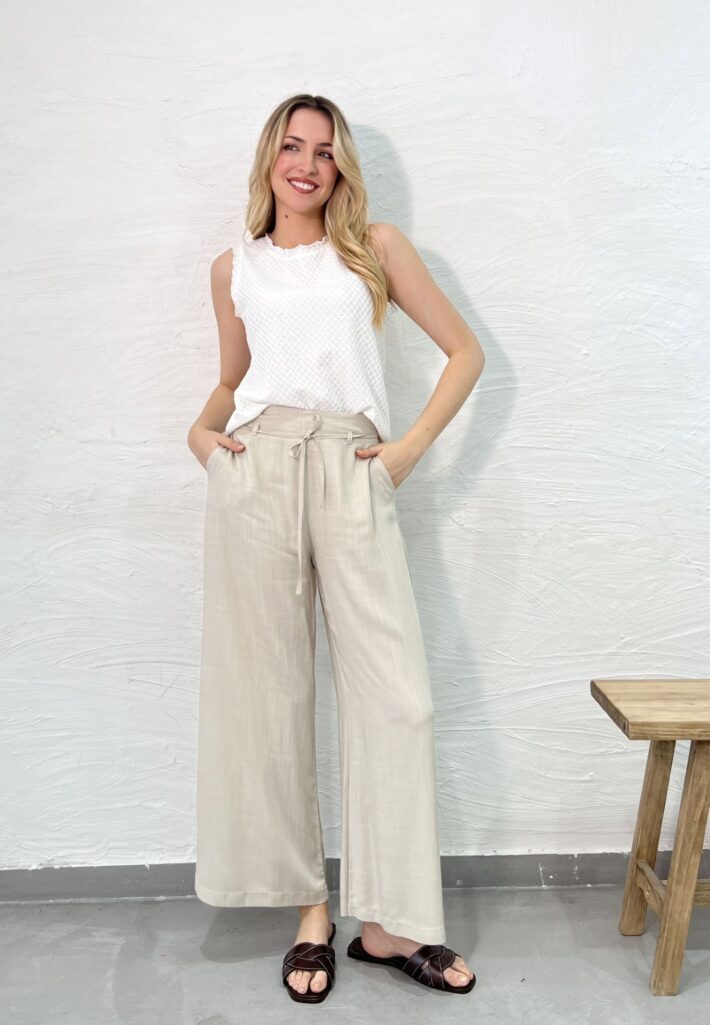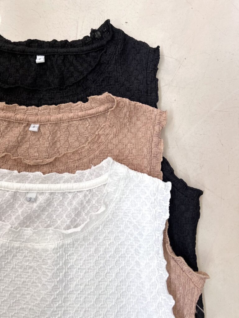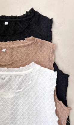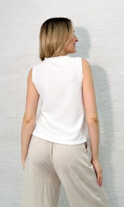 Remera sin mangas cuello redondo en tela de punta con textura diferenciada. Terminación ruloté en cuello y sisa.