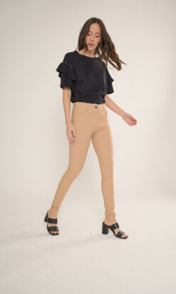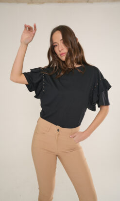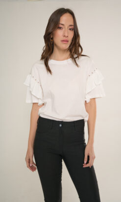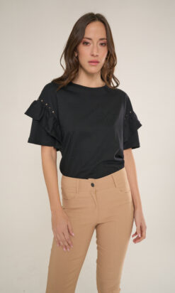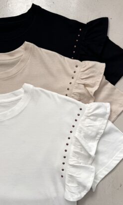 Remera en jersey algodón mangas cortas hombros bajos. Mangas con volados y tachas alrededor de sisa.