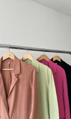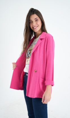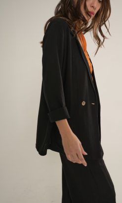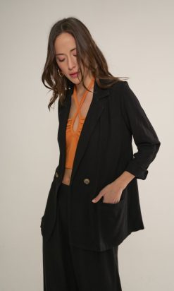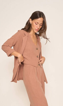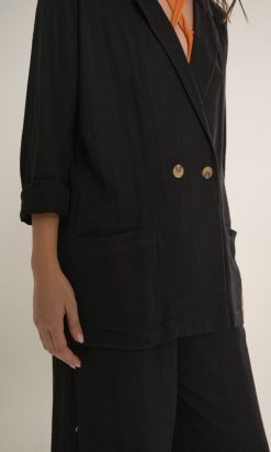 Saco cruzado en lino pesado fluido. Bolsillo ojal en delantero. Botones marmolados. Podés combinar con *Pantalón Mykonos.
