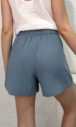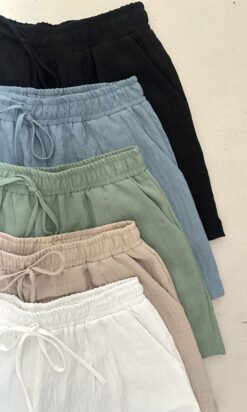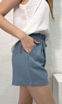 Short en símil lino con pinzas. Cintura con elástico en todo su contorno y tirita para atar. Bolsillos en los laterales.
