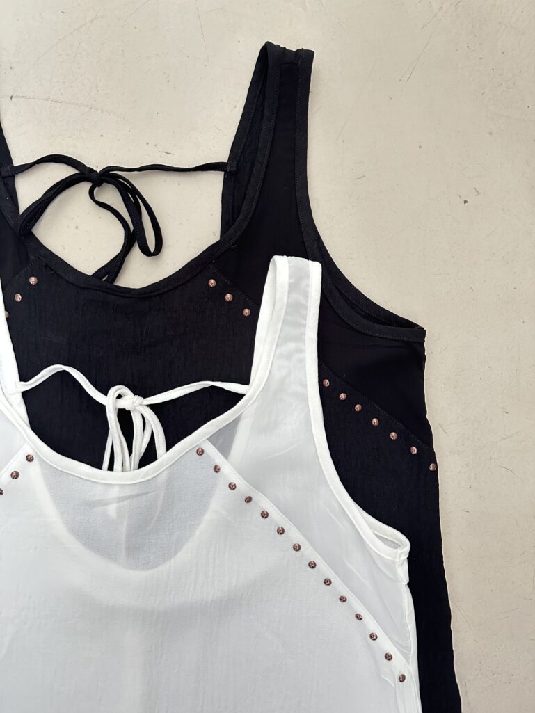 Top en crepe cey combi gasa en breteles delanteros con detalle de tachas en división. Espalda con tiritas ajustables para atar.